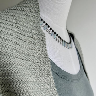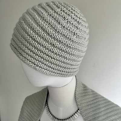 Das Muster sieht auf beiden Seiten gleich aus, was ich bei Schals und Tüchern schätze. Gestrickt werden im Wechsel je zwei Reihen/Runden (bei der Mütze) rechts und links.